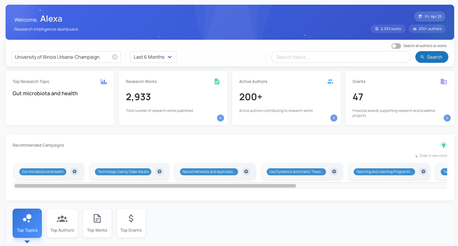 Get a comprehensive view of your campus’s research landscape. Mission Control brings together grant data, research activity, faculty insights, and industry collaboration tools—empowering you to drive innovation, strengthen partnerships, and accelerate research impact.